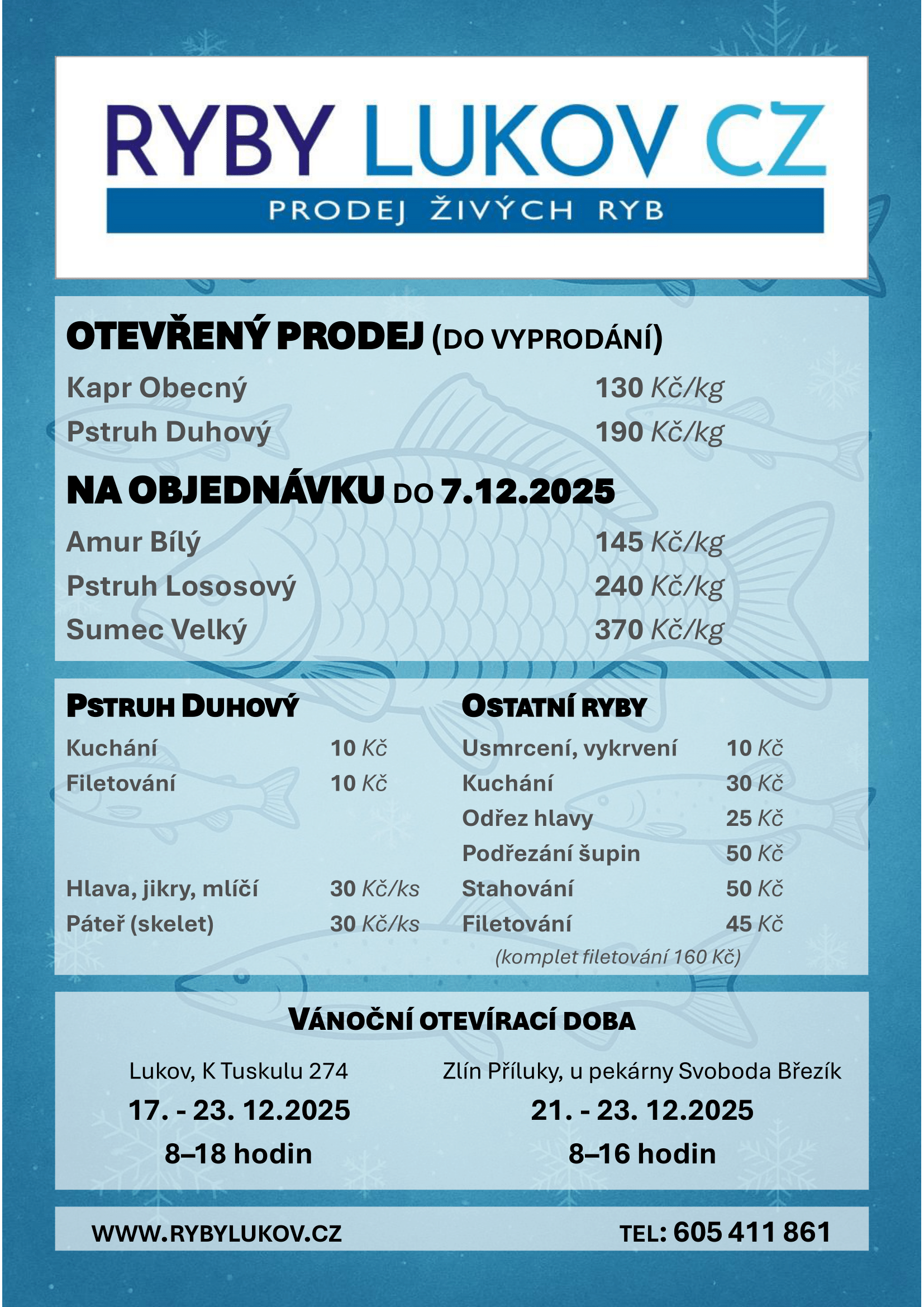 Aktuálně máme v nabídce Pstruha duhového, Kapra obecného a Amura bílého.